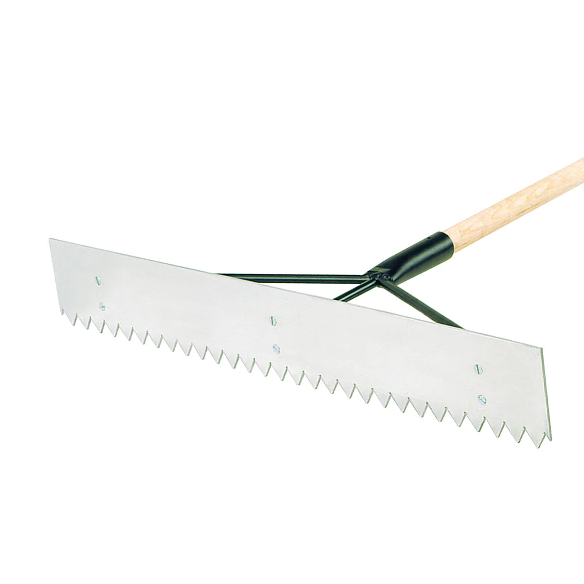 Der starke Grobzahnschaber aus Aluminium hat eine wirksame Arbeitsbreite von 80 cm. Dieses Gerät wird bei der Frühjahrsüberholung zum Aufrauen, Abkratzen und Egalisieren der Tennisplatzdecke verwendet. Es besteht aus einer glatten und einer grobgezahnten Seite, zur beidseitigen Anwendung.